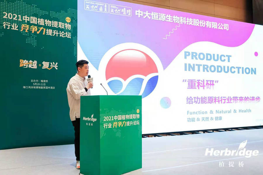2021年5月20-21日第12屆中國植物提取物行業(yè)競爭力提升論壇在海口市舉行,河南中大恒源生物科技股份有限公司銷售總經(jīng)理金子恒應(yīng)邀參會,并在論壇作了《“重科技”給功能原料行業(yè)帶來的進步》主題演講,引發(fā)與會人員的廣泛關(guān)注。